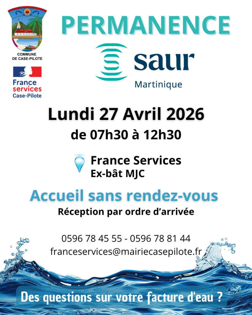 Dans le cadre de l’accompagnement des administrés dans leurs démarches liées à l’eau, la SAUR Martinique tiendra une permanence à Case‑Pilote le lundi 27 avril 2026.