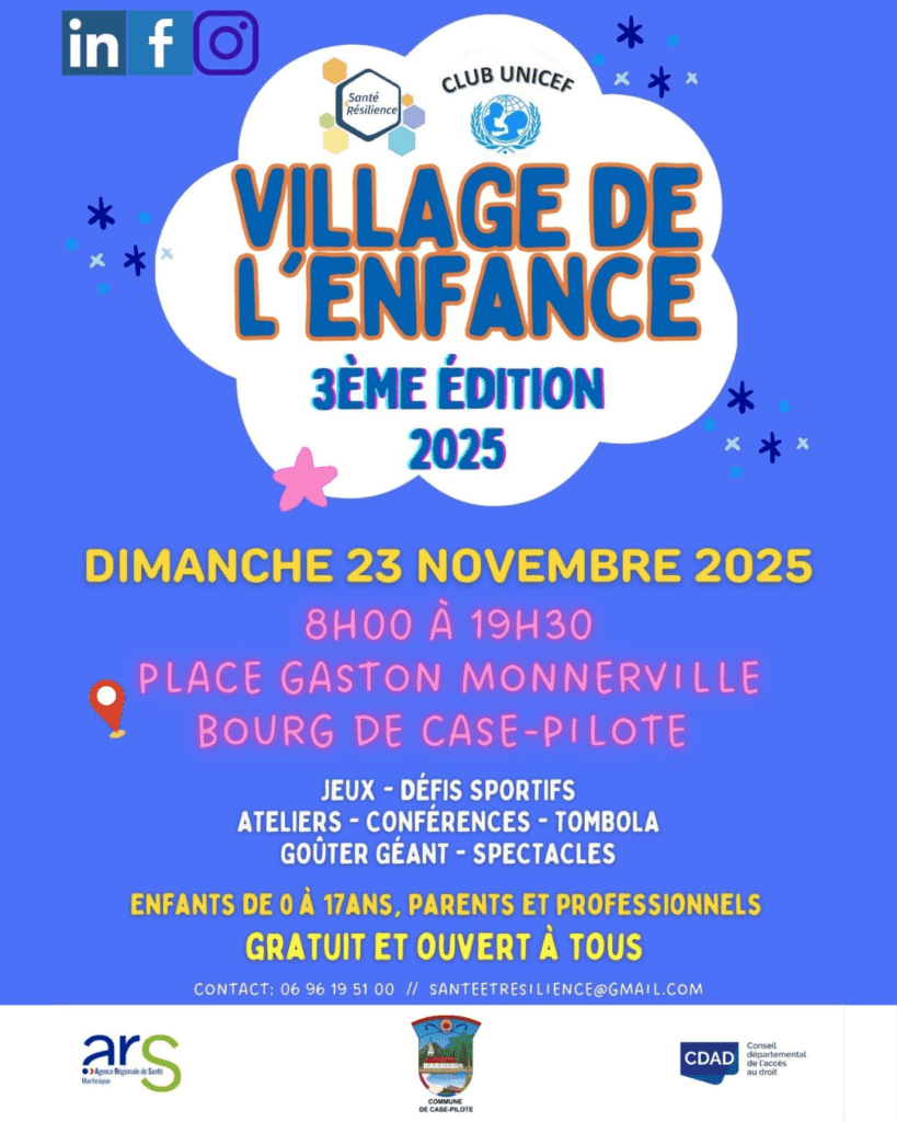 L’association Santé Résilience, en collaboration avec la Ville de Case-Pilote organise la 3ème édition du Village de l’Enfance.